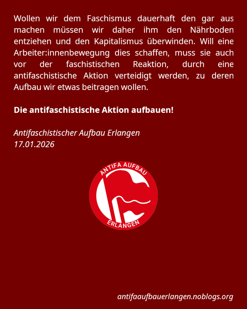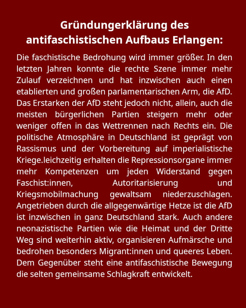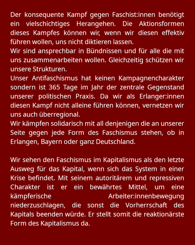 Wir kämpfen solidarisch mit all denjenigen die an unserer Seite gegen jede Form des Faschismus stehen, ob in Erlangen, Bayern oder ganz Deutschland.