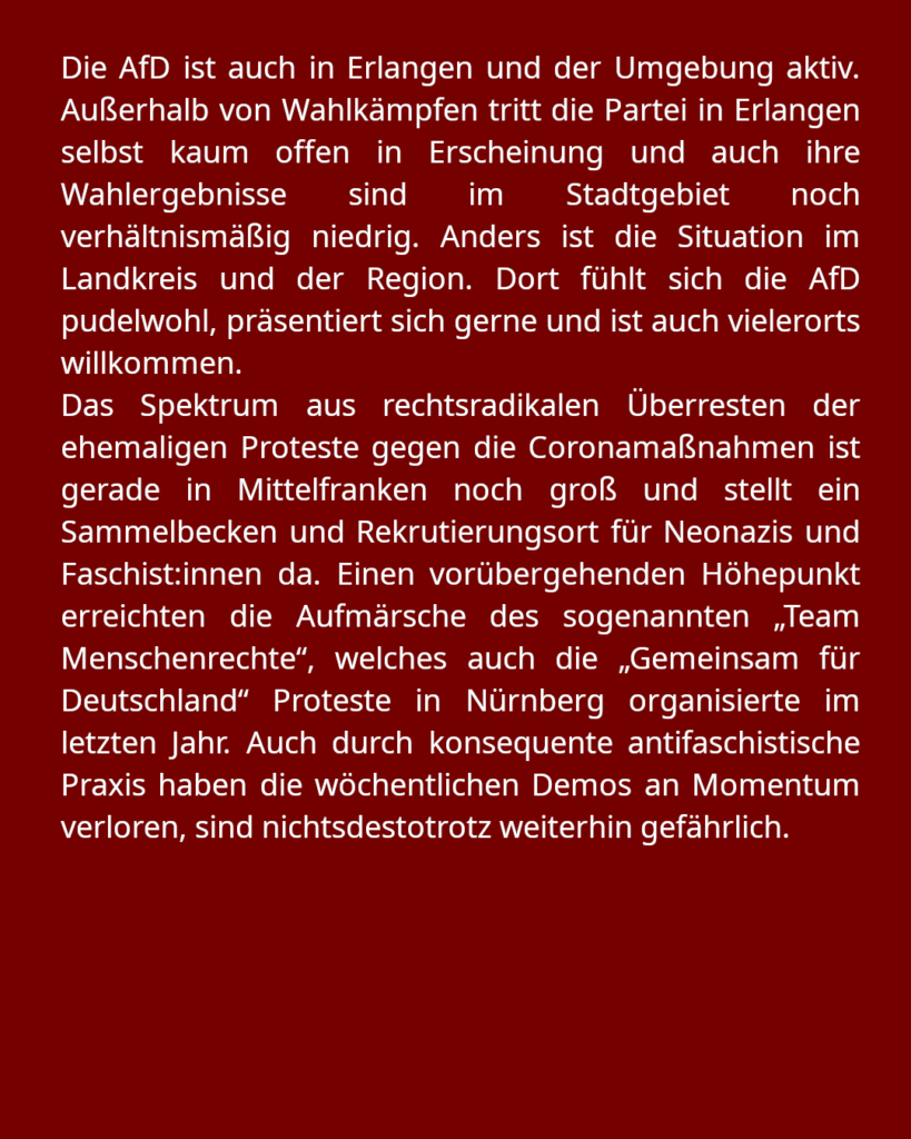 Das Spektrum aus rechtsradikalen Überresten der ehemaligen Proteste gegen die Coronamaßnahmen ist gerade in Mittelfranken noch groß und stellt ein Sammelbecken und Rekrutierungsort für Neonazis und Faschist:innen da. Einen vorübergehenden Höhepunkt erreichten die Aufmärsche des sogenannten „Team Menschenrechte“, welches auch die „Gemeinsam für Deutschland“ Proteste in Nürnberg organisierte im letzten Jahr. Auch durch konsequente antifaschistische Praxis haben die wöchentlichen Demos an Momentum verloren, sind nichtsdestotrotz weiterhin gefährlich.