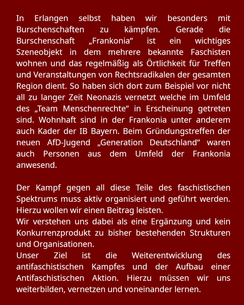 In Erlangen selbst haben wir besonders mit Burschenschaften zu kämpfen. Gerade die Burschenschaft „Frankonia“ ist ein wichtiges Szeneobjekt in dem mehrere bekannte Faschisten wohnen und das regelmäßig als Örtlichkeit für Treffen und Veranstaltungen von Rechtsradikalen der gesamten Region dient. So haben sich dort zum Beispiel vor nicht all zu langer Zeit Neonazis vernetzt welche im Umfeld des „Team Menschenrechte“ in Erscheinung getreten sind. Wohnhaft sind in der Frankonia unter anderem auch Kader der IB Bayern. Beim Gründungstreffen der neuen AfD-Jugend „Generation Deutschland“ waren auch Personen aus dem Umfeld der Frankonia anwesend.